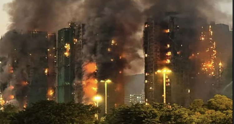 The fire broke out around 3 p.m. and quickly escalated to a level-5 alarm, the city’s highest alert. The blaze spread rapidly along bamboo scaffolding and construction netting surrounding several buildings undergoing renovation, causing flames to extend vertically and jump from block to block.